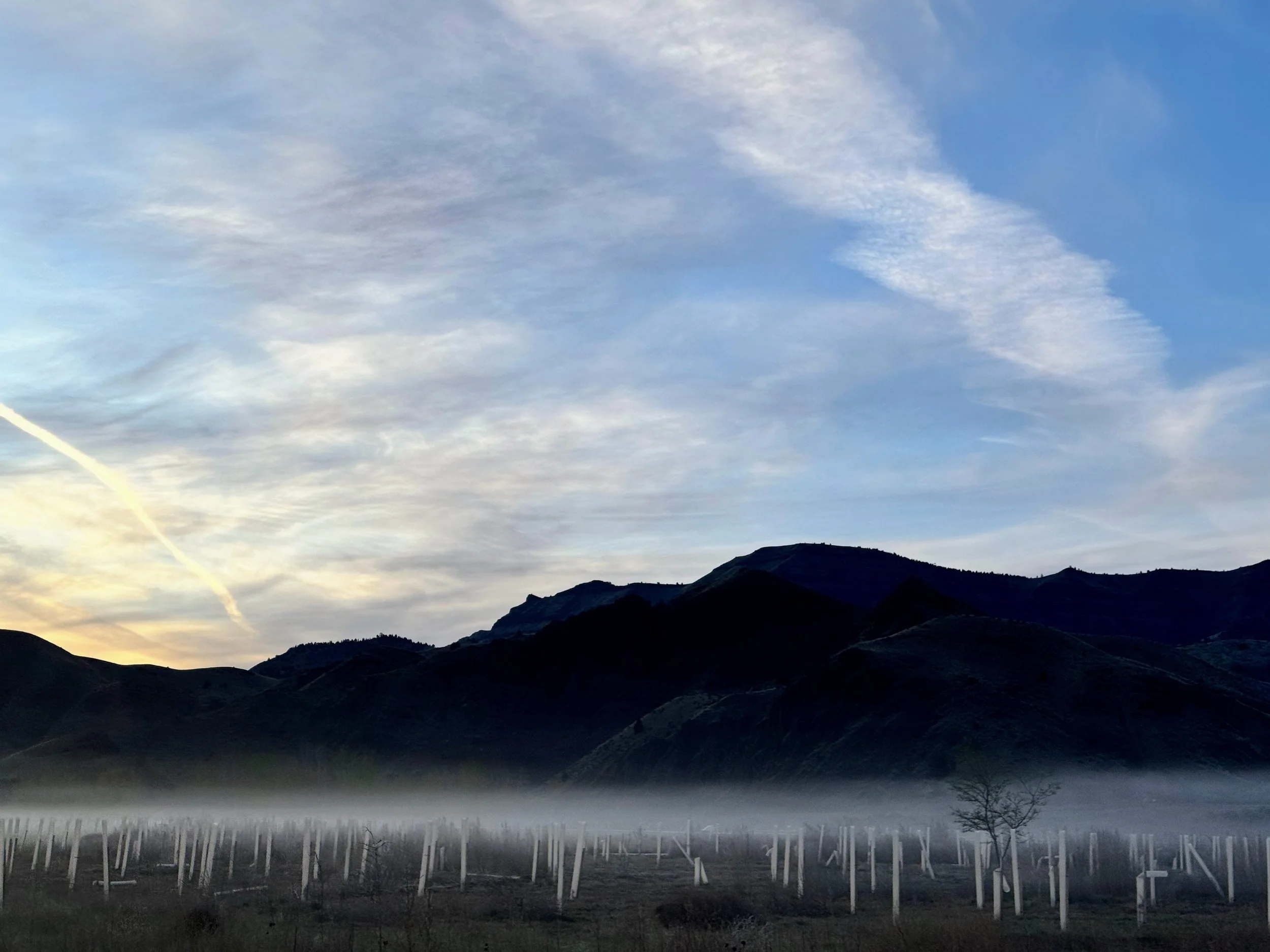 Dawn’s radiation fog skims the tops of the plastic-sleeved grove. John Day River. Eastern Oregon. 2026