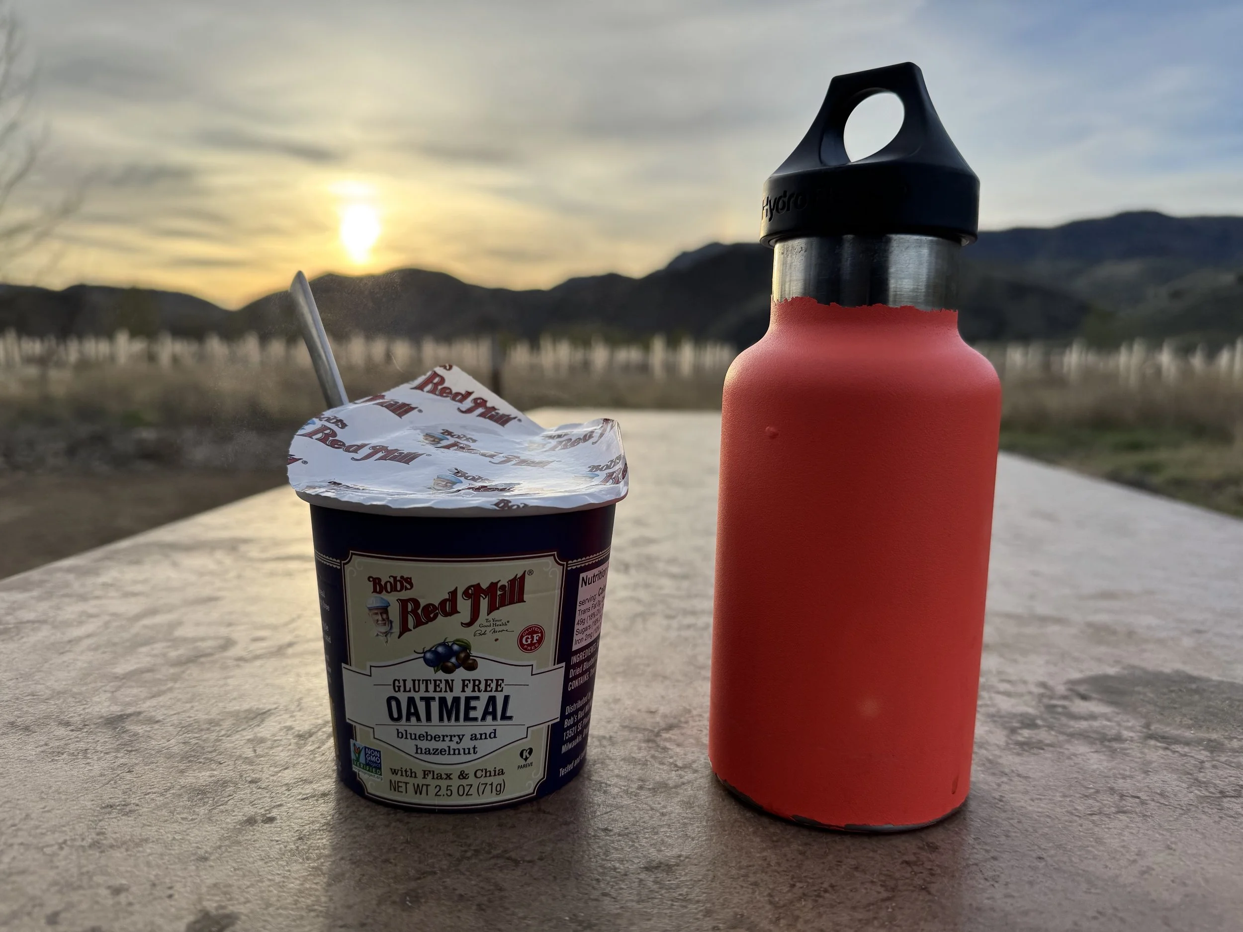 Solid, outdoorsy, adventure breakfast of instant blueberry oatmeal and a thermos of black coffee. 2026, John Day River. Eastern Oregon. 2026