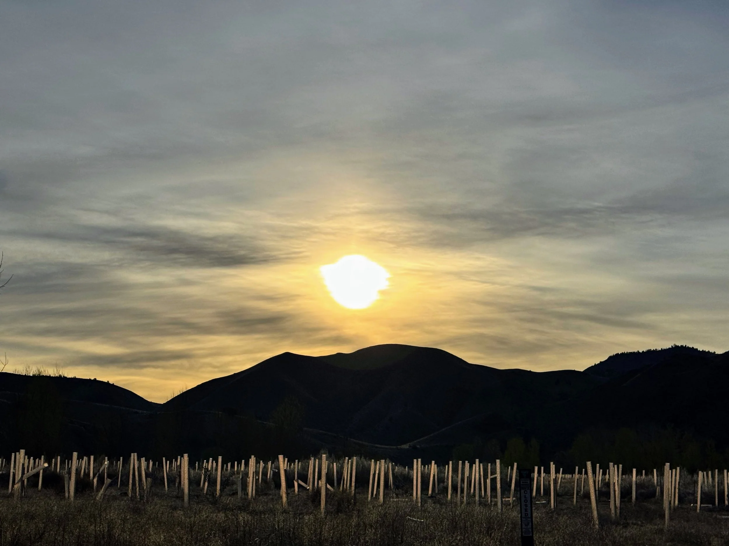 Sunrise illuminated the plastic-sleeved grove. John Day River. Eastern Oregon. 2026.
